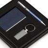 Kit executivo com 3 peças em estojo preto de papelão revestido com espuma interna. Possui: caneta metal prata com detalhes coloridos e quadriculados, clip metal com anel superior na ponta e dois anéis centrais(aciona por giro); porta cartão em couro sintético texturizado com detalhes em metal(detalhes em metal externos espelhados e internos escovados e parte interna com veludo) fecha por imã; chaveiro metal retangular com chapa espelhada(fumê) e parte traseira texturizada.