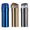 Garrafa térmica 350ml colorida com sistema de trava. Material metálico com revestimento interno em inox, possui tampa plástica fosca com borracha interna para vedação evitando o vazamento de líquido e prezando sua temperatura; possui botão central para abertura e trava lateral(basta seguir a orientação dos desenhos de cadeados simulando o travamento/destravamento da tampa).